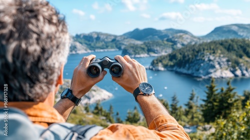 © Pinklife, Obraz premium A man wearing an orange shirt is seen from behind while using binoculars to look at the vast, scenic mountain landscape with a lake in the background.