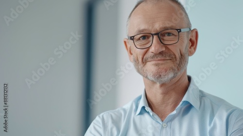 Obraz premium A man wearing glasses and a blue shirt is smiling