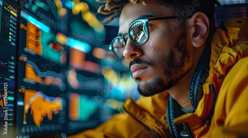 © john, Obraz premium A man wearing glasses is looking at a computer screen with a lot of numbers on it. He is wearing a yellow jacket and he is focused on the screen