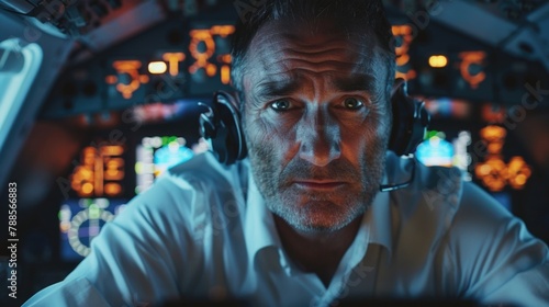 Fototapeta premium A man wearing headphones in a cockpit. Perfect for aviation industry promotions