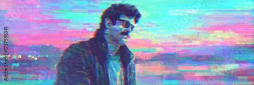 © Anat art, Fototapeta premium A man wearing sunglasses stands by the water, surrounded by a colorful, retro landscape at sunset, combining vibrant hues and digital aesthetics.