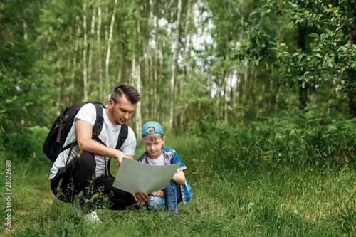 © Aliaksandr Marko, Fototapeta premium A man with a backpack, a father and his son on a hike look at the map, walking during walks in the woods. Family life, pastime with the family, the upbringing of children.