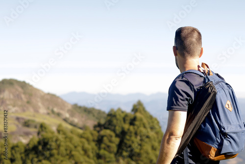 © Raquele, Naklejka premium A man with a backpack looking at the mountains.