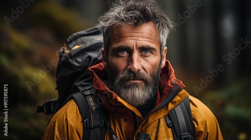 Obraz premium A man with a beard and a backpack is standing in the woods