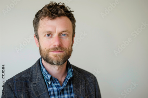 © Sascha, Obraz premium A man with a beard and a blue shirt is smiling for the camera