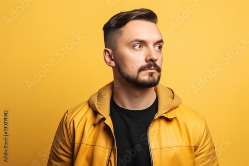 © MediaRaw, Fototapeta premium A man with a beard and a yellow jacket is standing in front of a yellow wall