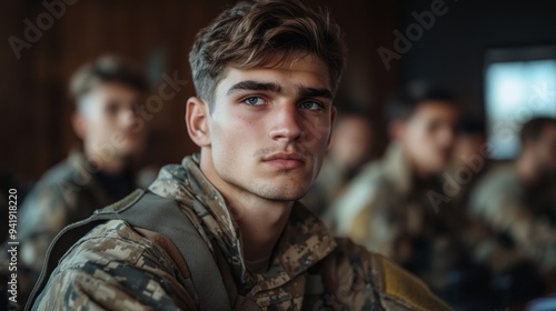 © liliyabatyrova, Fototapeta premium A man with a beard and blue eyes is sitting in a room with other men