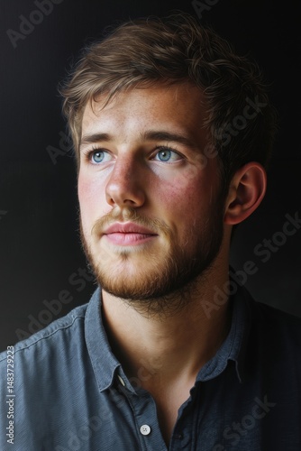 © Oleksandr Pashchenko, Obraz premium A man with a beard and blue eyes looking at the camera