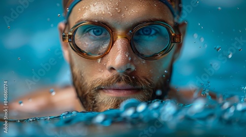 Fototapeta premium A man with a beard and glasses is swimming in the water, wearing goggles and...