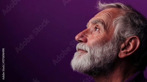 © Cloudyew, Obraz premium A man with a beard and gray hair is looking up at something