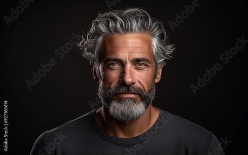 Naklejka premium A man with a beard and gray hair is smiling at the camera. He is wearing a black shirt and he is in a good mood