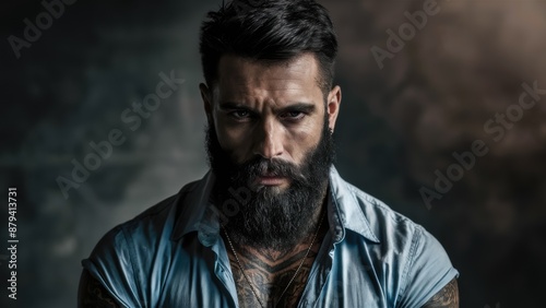 Fototapeta premium A man with a beard and tattoos on his chest, AI
