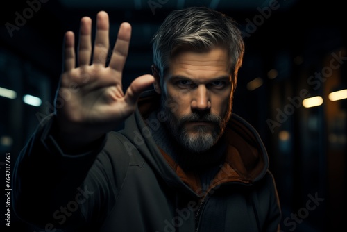 Fototapeta premium A man with a beard holds up his hand, palm forward, with a serious expression on his face
