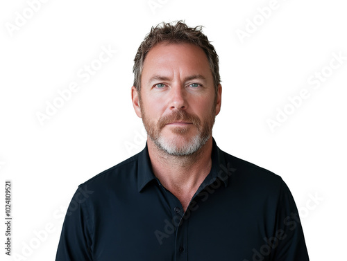 © olegganko, Obraz premium A man with a beard in a dark shirt poses confidently against a neutral background