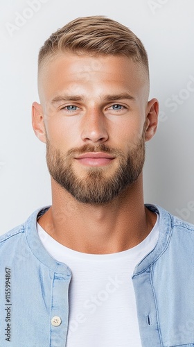 © Janis, Obraz premium A man with a beard wearing a blue shirt