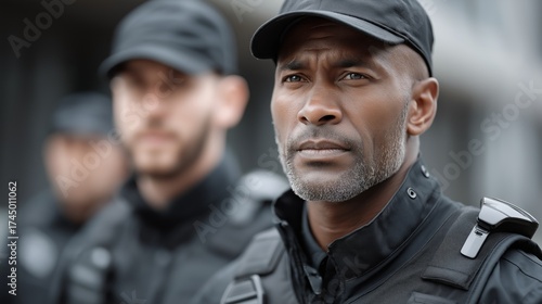 © Gulnaz, Fototapeta premium A man with a black hat and a black vest stands with two other men