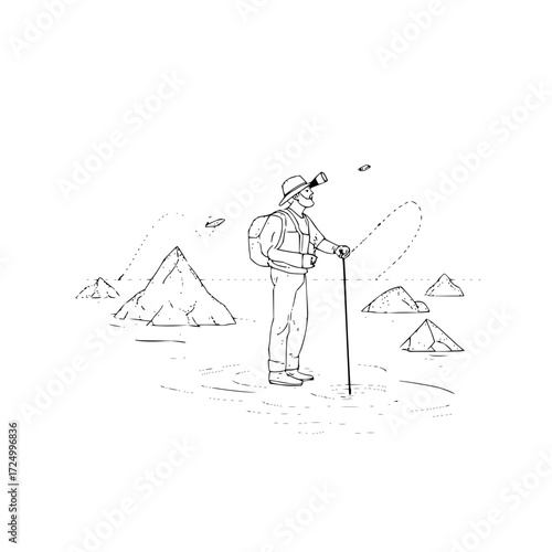 Naklejka premium A man with a hat and backpack standing among rocks with a stick in a sketched...