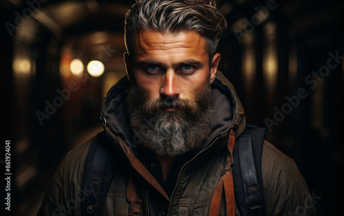 Obraz premium A man with a long beard and a dark jacket stands in a dimly lit alley