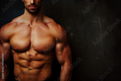 Fototapeta premium A man with a muscular body is standing in front of a dark background. Concept...