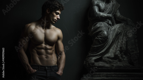 Naklejka premium A man with a muscular body is standing in front of a statue