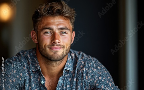 © hakule, Obraz premium A man with a mustache and a floral shirt is smiling