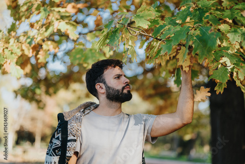 © qunica.com, Obraz premium A man with a pensive expression examines vibrant autumn leaves in a serene park setting. The scene captures the essence of fall and outdoor exploration, highlighting a moment of nature appreciation.