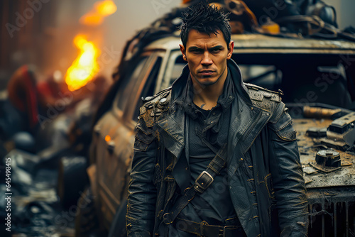 © VicenSanh, Fototapeta premium a man with a postapocalyptic style portrait, with a car in the background and fire