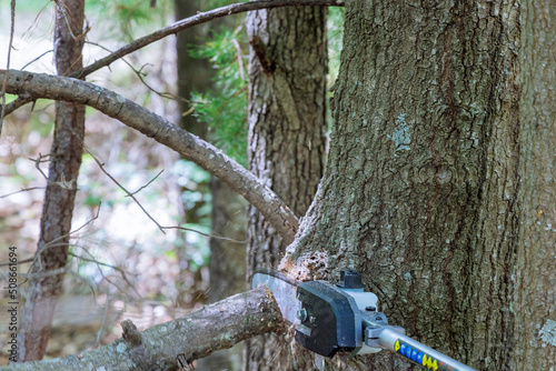 Naklejka premium A man with a saw cuts a branch of a tree in forest park