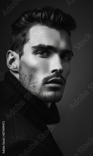 Obraz premium A man with a sharp jaw and an intense gaze. This image represents strong masculinity and a confident personality.
