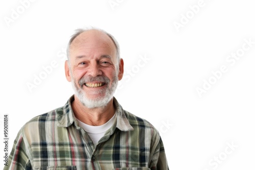 Fototapeta premium A man with a white shirt and a plaid shirt is smiling. He has a beard and a...