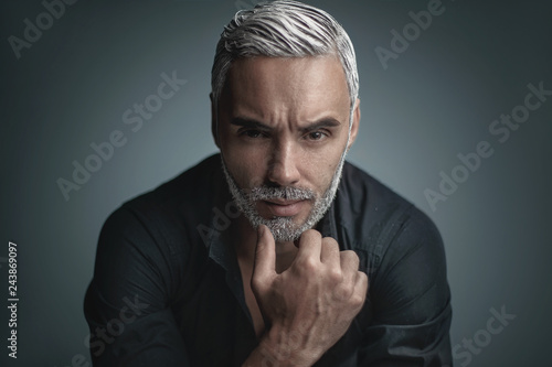Fototapeta premium A man with blond hair and a beard looks into the camera.
