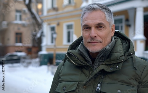 Fototapeta premium A man with gray hair standing in the snow, wearing a green jacket