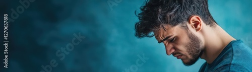 © pitchanat, Obraz premium A man with his head in his hands sitting alone in a dimly lit room reflecting deep emotions and struggles evoking feelings of sadness and despair