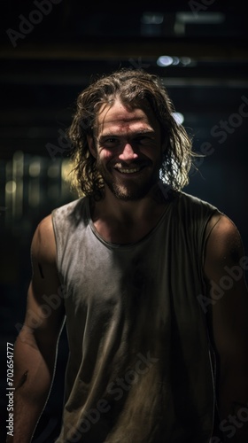 © sergio, Fototapeta premium A man with long hair wearing a tank top. Generative AI.