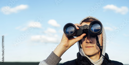 © Nadya Vetrova, Obraz premium A man with modern binoculars against the sky and green hills. The concept of hunting, travel and outdoor recreation. Banner with copy space.