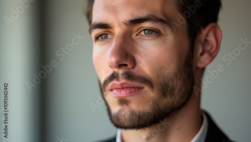 © ArtPro, Obraz premium A man with short small beard styles, perfectly sculpted for a clean and polished appearance.