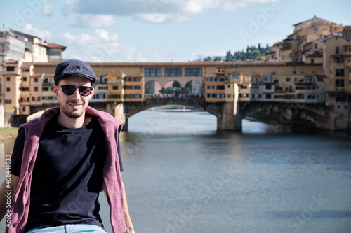 © Leandro, Obraz premium a man with sunglasses and a beret on the Ponte Vecchio