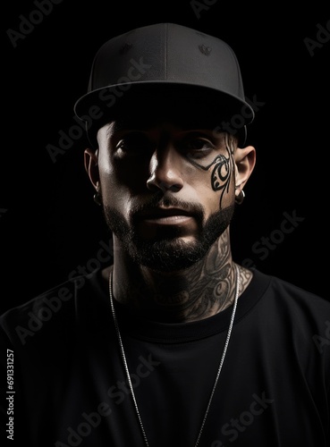 © olegganko, Fototapeta premium a man with tattoos and a black cap