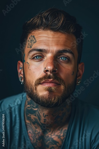 © Studio, Fototapeta premium A man with tattoos on his face and neck