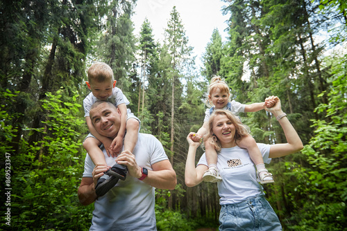 Fototapeta premium A man, woman, and child having fun and playing in the forest or park in...