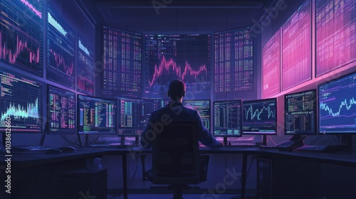 © Johannes, Fototapeta premium A man works as an operator specialist in a computer data center in front of many monitors with charts and data