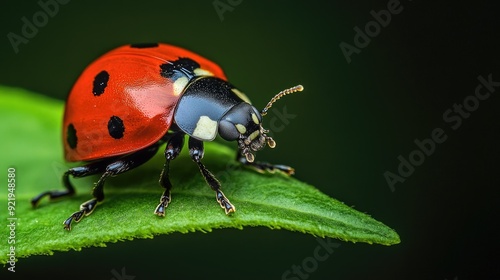 © savittree, Naklejka premium A mariquita, or ladybug, is showcased in a macro shot, each detail of its tiny body crisp and vivid on a green leaf.