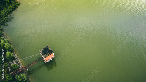 © Andrew Sankov, Fototapeta premium a marsh-colored lake, in the corner there are green bushes on concrete slabs, a small red-brick building with a black roof stands on the water across a small iron bridge