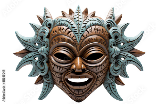 © Rattanathip, Naklejka premium A mask with a smiling face and a blue and brown design. The mask is made of wood and has a feathery look to it