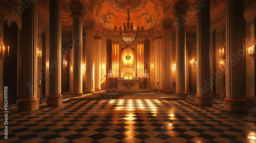 © Kristina, Obraz premium A Masonic lodge interior with ornate columns, checkerboard flooring, and a central altar illuminated by soft candlelight