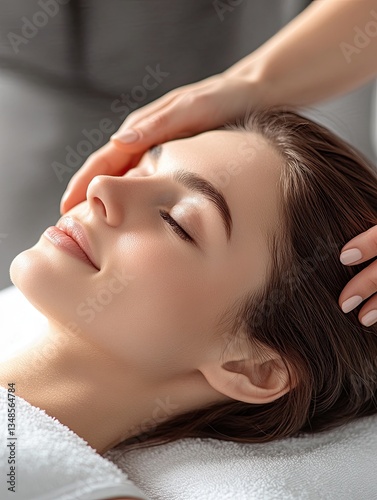 Fototapeta premium A masseur's hands massage a relaxed woman's face as she undergoes relaxation therapy in a brand new luxury spa.