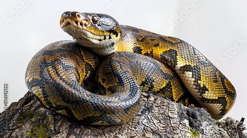 © dongwei, Obraz premium A massive anaconda, with its powerful body and distinctive scales, coils around a tree trunk against a white background, its eyes gleaming with predatory intent. The image captures the animal's