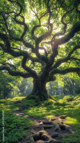 © novian, Naklejka premium A massive ancient tree with expansive branches in a forest
