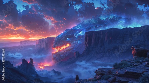 Naklejka premium A massive, bioluminescent creature slumbers at the bottom of a deep canyon,...