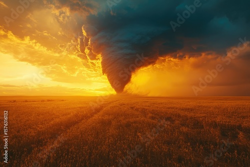 © stockphoto02, Obraz premium A massive dark tornado touches down in a golden wheat field at sunset, a dramatic and awe-inspiring scene.